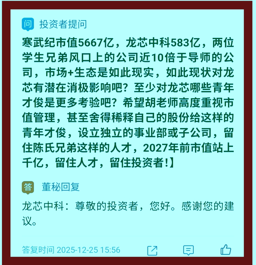 “寒武纪市值5667亿,龙芯中科583亿,两位学生兄弟风口上的公司近10倍于导师的公司,市场+生态是如此现实,如此现状对龙芯有潜在消极影响吧?至少对龙芯哪些青年才俊是更多考验吧?希望胡老师高度重视市值管理,甚至舍得稀释自己的股份给这样的青年才俊,设立独立的事业部或子公司,留住陈氏兄弟这样的人才,2027年前市值站上千亿,留住人才,留住投资者!】”。