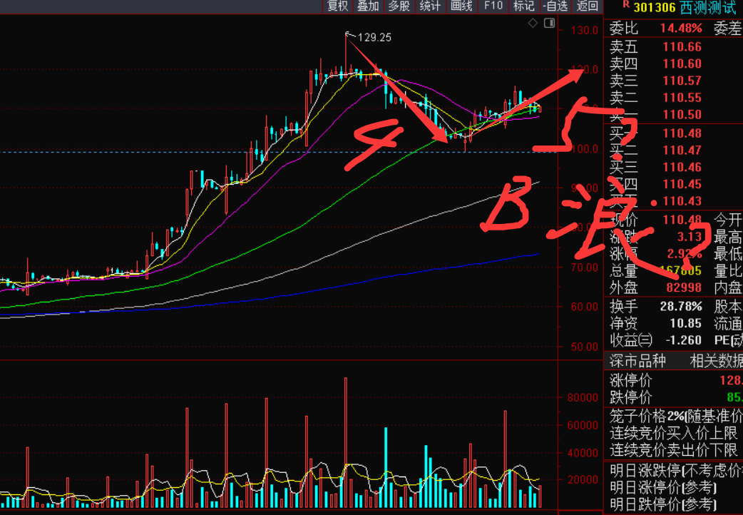 这票前面减了一半,现在还剩下点仓位就一直格局了,今天航天题材大面积涨停它才涨了小几个点确实磕碜了点,技术形态上它现在既可以是5浪也可以是B浪反弹,后面两个交易日恐怕就会见分晓了,昨天今天板块大涨它都不涨,老A还是有点担心它会走B浪反弹然后掉下来,即:它可能无法创新高突破130这顶部了,大家要做好这个心理准备。