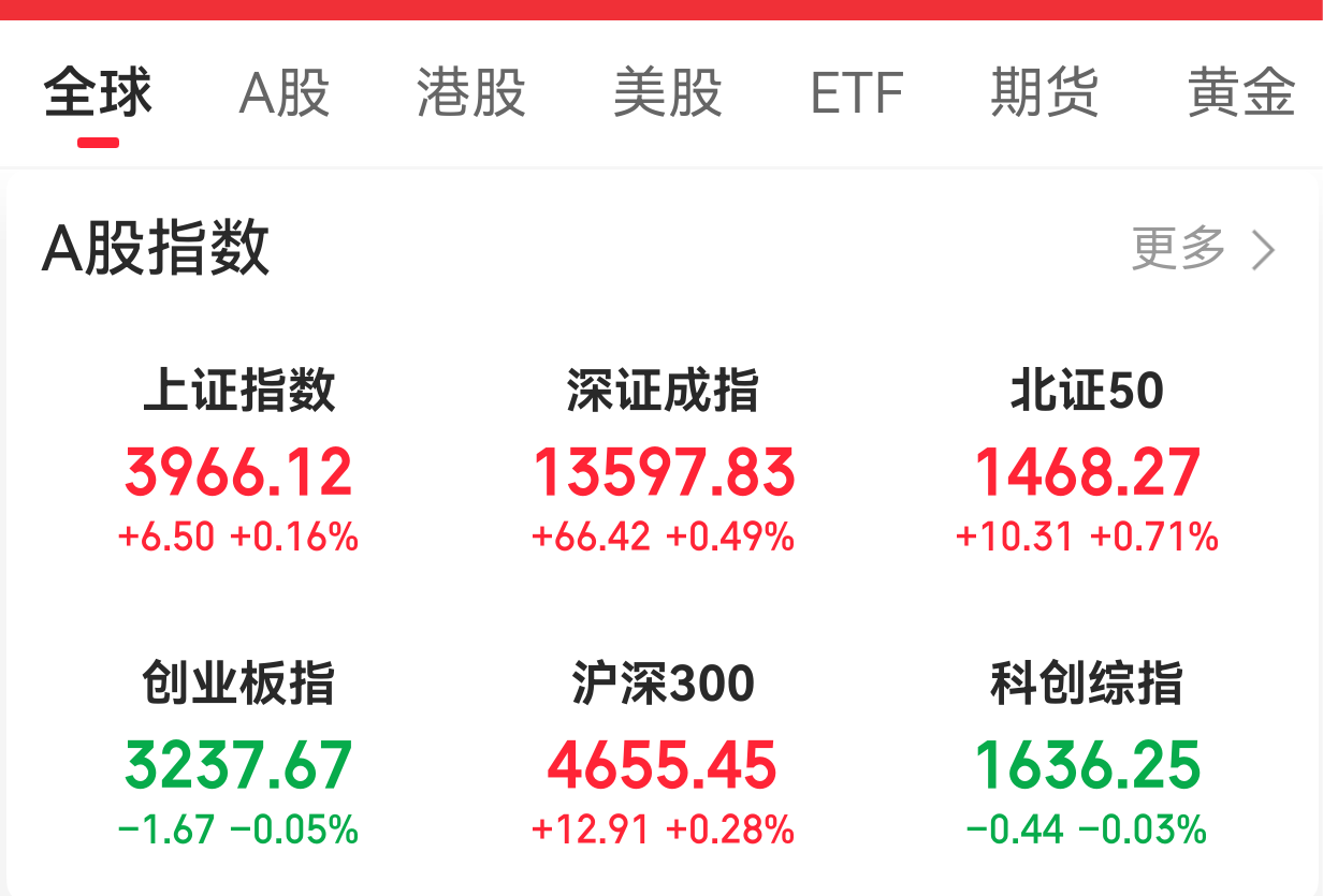 截至发文, 上证指数上涨0.16%,报3966点;深证成指上涨0.49%,报13597点;创业板指小幅下跌0.05%,报3237点。