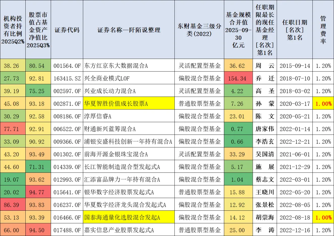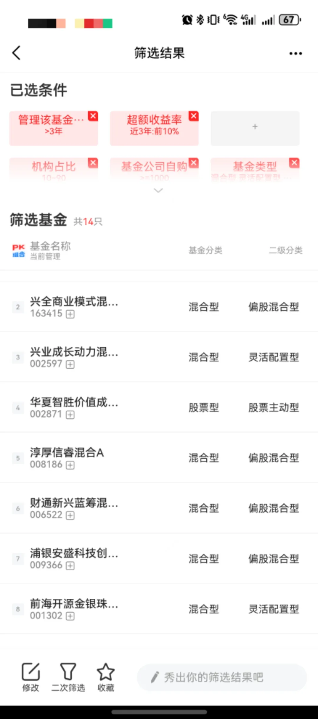 基金公司自购超1000万元,管理该基金超3年,超额收益率近三年处于前10%,机构占比在10%~90%,基金类型是偏股混合型、股票主动型、混合型、灵活配置型几种,筛选可得只有14只基金。