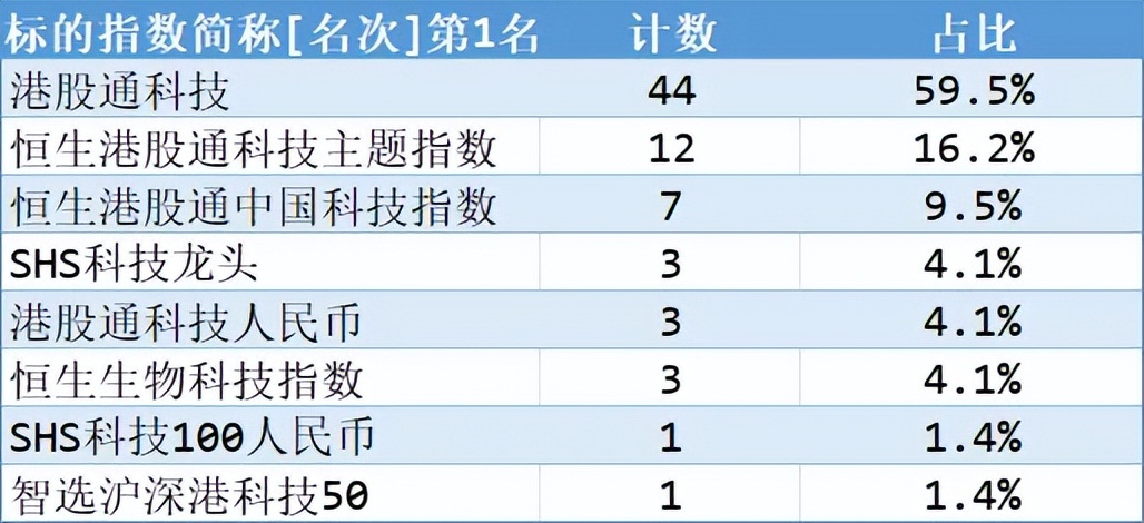 如果要求是被动指数型基金,名称中有“恒生”或“港”字样,且还有“科技”两个字,满足条件的基金有74只基金(多份额分开计算),这其中大部分跟踪的是科技类指数,详见下表。