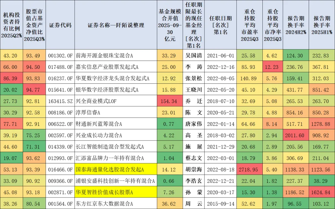 下图展示了2025Q3重仓股平均市盈率、平均市净率,以及2024下半年、2025上半年换手率数据如下:换手率较高的除了孙蒙、胡崇海外,还有唐家伟、高圣、陈文等。@天天基金网 @天天基金研究中心 @天天基金创作者中心 #社区牛人计划##炒股日记##基金投资指南#