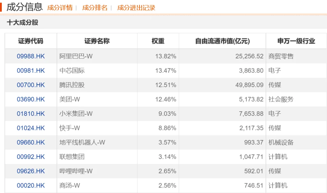 恒生港股通中国科技指数当前的前十大重仓股展示如下:包括了阿里巴巴、中芯国际、腾讯控股、美团、小米集团、快手、地平线机器人、联想集团、哔哩哔哩、商汤。