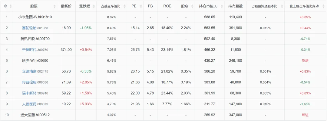 下图是2025Q3重仓股,分别是小米集团、赛轮轮胎、腾讯控股、宁德时代、途虎、立讯精密、传音控股、瑞丰新材、人福医药、远大医药,合计权重64.26%,其中A股有6只,H股有4只。2025年三季度新买入的有远大医药。