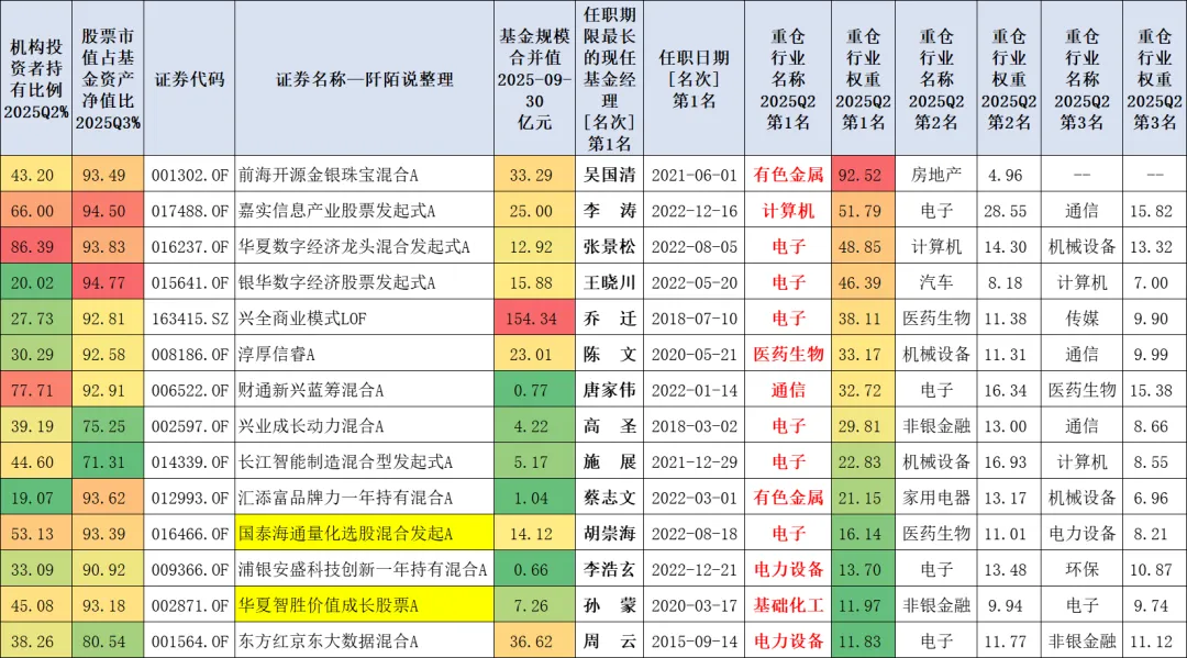 14只基金展示2025年中报第一重仓至第三重仓行业及其权重信息如下:并按照第一重仓行业权重由高到低排序如下:吴国清的第一重仓行业是有色金属权重高达92.52%,李涛的第一重仓行业是计算机权重也高达51.79%……行业配置较重的还有张景松等。