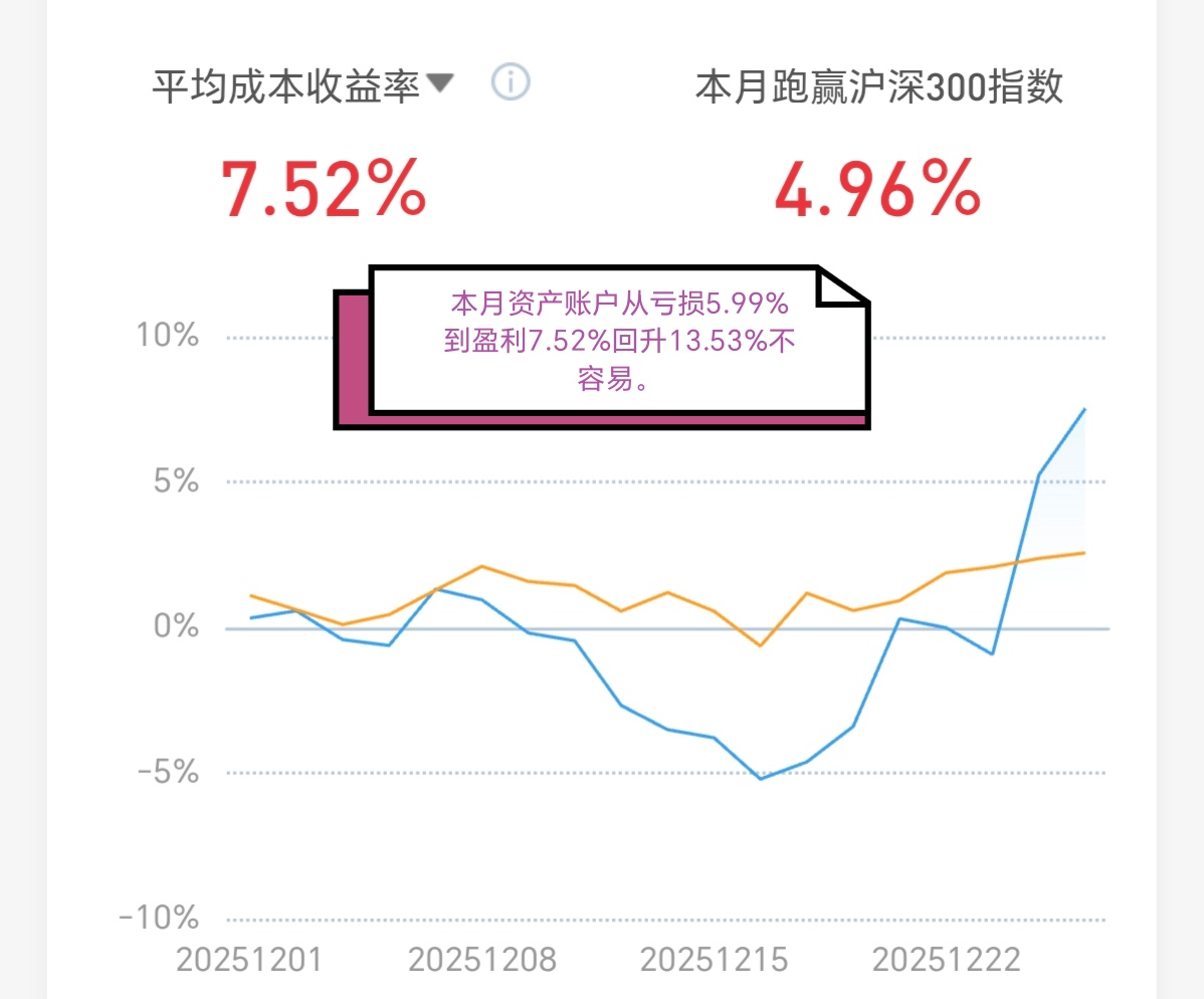 本周我的收益还是不错的,本来十二月收益率负的超5%,最近总资产收益率回升超过12%,本月赚钱的股票下面贴出来,周五新股$C天溯(SZ301449)$上涨超27%,而健信超导继续杀跌4.61%,由于我中签该股所以一直关注,本来也想参与投机炒作,所以先用模拟盘试试手,结果如此大跌造成严重亏损不寒而栗,如果真的实盘就不得了,手中持有的富瑞特装还是比较强,商业航天就是跨年度重点方向,$航天发展(SZ000547)$就是强。至于浙江永强还是等待补掉3.92元分时缺口再加仓。#社区牛人计划##炒股日记##复盘记录##强势机会##实盘记录#,说明短线走势确实很难判断,难道周五一次跳水就算完了吗?我觉得绝对不会这么简单,即使本周三天继续震荡走高收在四千点之上,元旦之后还是要回踩考验双底颈线位3936点,考验之后才能启动明年的春季行情,届时可以满仓抄底,接下来继续上涨还是要降低仓位到半仓进退自如,周五小跳水就是主力洗盘的特意动作,同时也是看看散户投资者恐慌程度。最后郑重警告在浙江永强股吧里的黑粉们捣乱只能自取其辱,我在浙江永强股票上还是能赚钱的,你们气死也是活该!所以奉劝你们改恶从善才是唯一出路,不要做无用功了,这个股票筹码跌下来我还是要捡回来的,这次不会像前面北京利尔、力源信息一样在大涨之前搞丢筹码了,这次踏空投资者不要追高了,等一月份回踩时再择机上车吧。