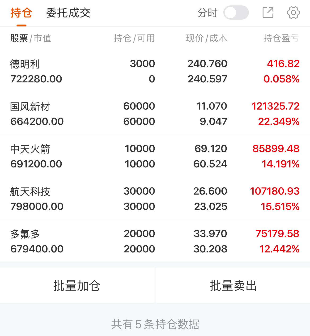 航天科技000901:周一走的还是比较强的,也是如期走出了四连阳,现在还是继续在上升通道之中,板块中的龙头中国卫星,神剑股份,航天发展都还是继续在走加速,航天科技现在位置也不算太高,后面依然还是看补涨的,短线继续坚定对他的信心。
