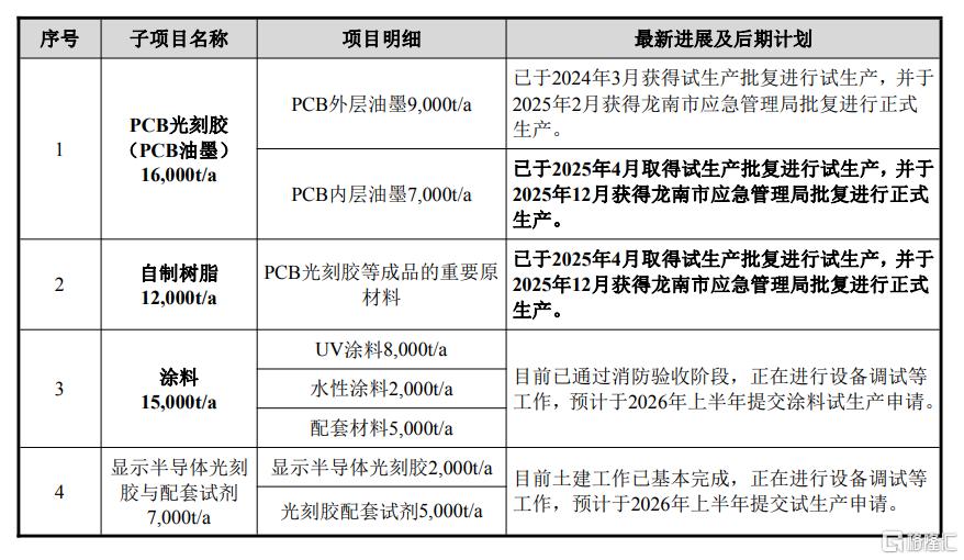 格隆汇12月29日丨广信材料(300537.SZ)公布,公司全资子公司江西广臻感光材料有限公司(简称“江西广臻”)于近日收到龙南市应急管理局出具的对《江西广臻感光材料有限公司年产5万吨电子感光材料及配套材料项目(11300t/a自制树脂及7000t/a内层油墨)安全验收评价报告备案意见》回复意见,龙南市应急管理局已同意公司募投项目“年产5万吨电子感光材料及配套材料项目”之“11300t/a自制树脂及7000t/a内层油墨”予以备案。后续公司将严格按照相关法律法规,有序组织生产,确保生产安全。公司本次募投项目的实施主体为全资子公司江西广臻感光材料有限公司(简称“江西广臻”)。公司本次募集资金投资项目所在的“年产5万吨电子感光材料及配套材料项目”主要分为4个子项目,本次涉及使用募集资金的主要为PCB光刻胶(PCB油墨)、涂料、自制树脂3个子项目,各子项目目前进展如下: