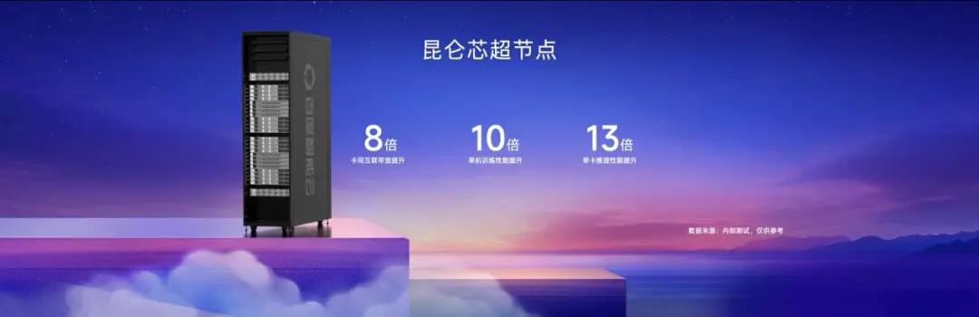 昆仑芯超节点支持把64张昆仑芯AI加速卡放到同一个机柜,实现单节点的超强性能,一个机柜就能顶过去100台机器。