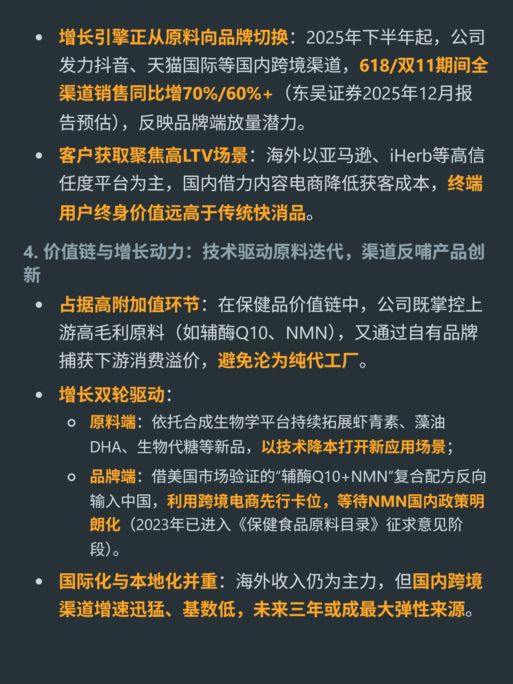 原料端用合成生物学降本,拓展虾青素、藻油DHA等新品;品牌端国内跨境电商增速快,2025年618/双11全渠道增70%/60%+。