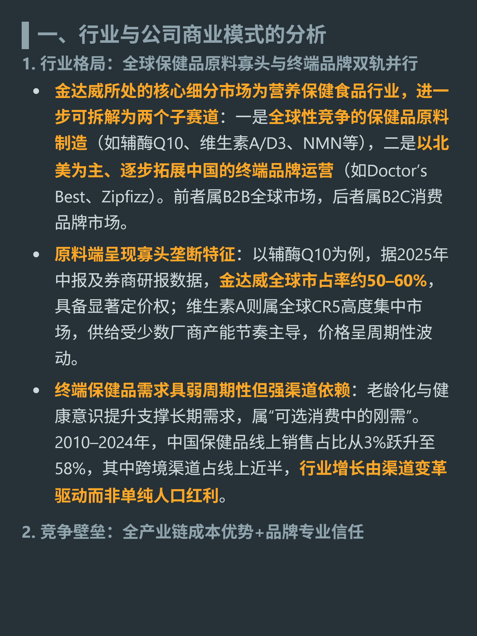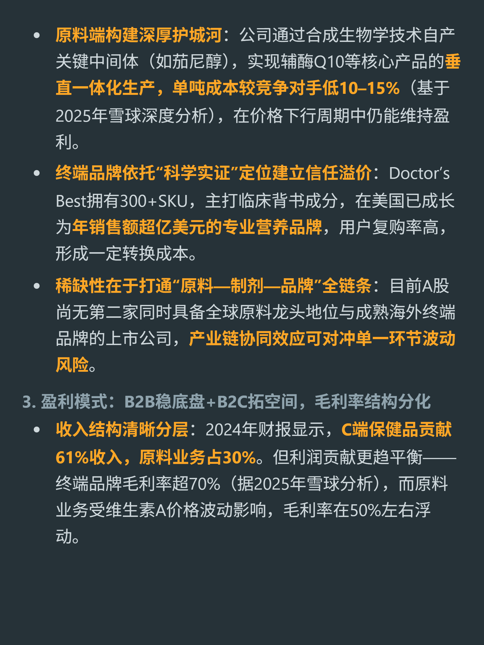 做营养保健品全产业链,B2B原料(辅酶Q10全球市占50-60%、维生素A等寡头市场)+B2C终端品牌(Doctor’s Best等),打通“原料—制剂—品牌”,避免纯代工。
