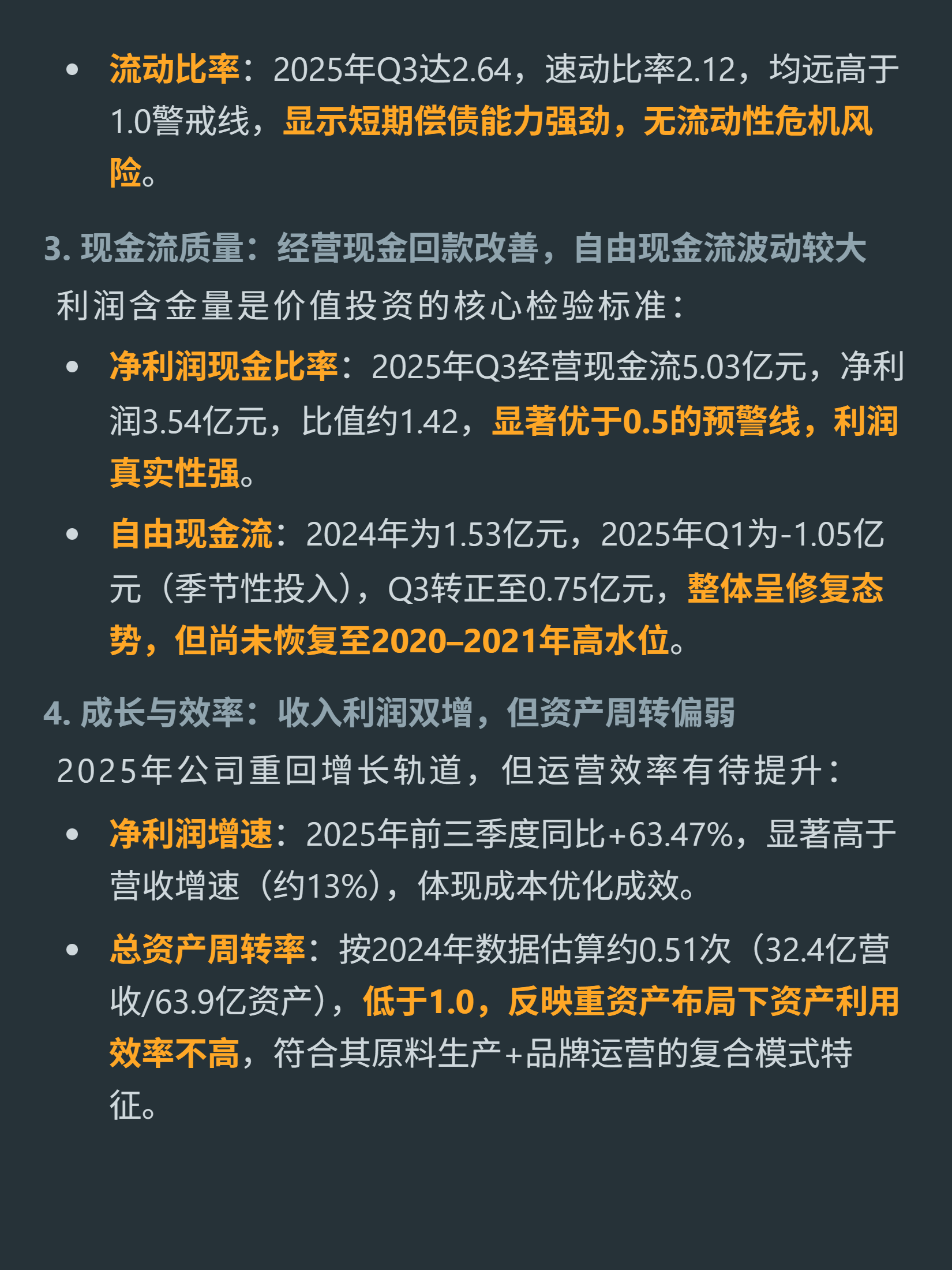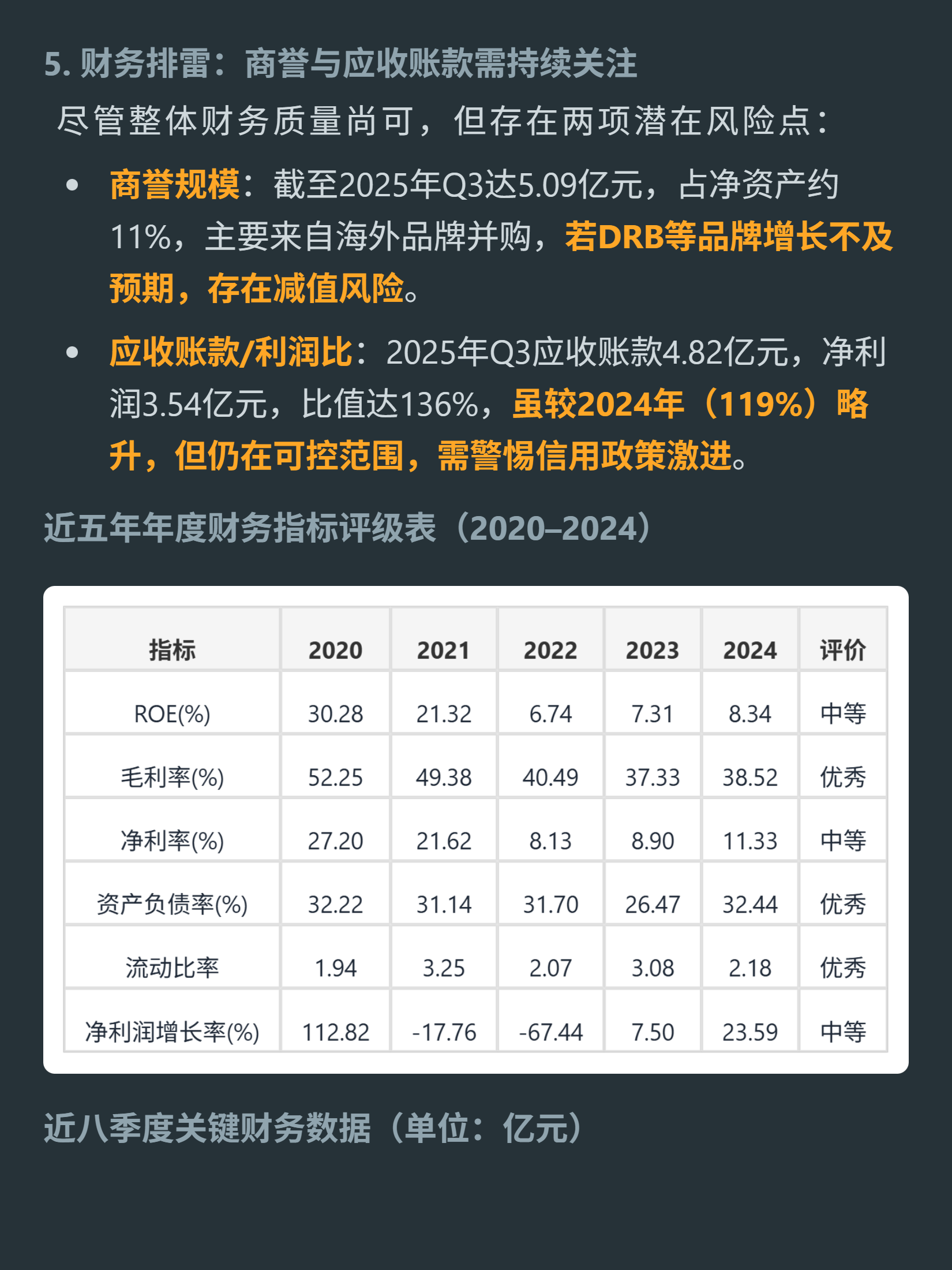 2024年C端占61%收入,终端品牌毛利率超70%,原料约50%;2025年前三季度净利润同比增63.47%,ROE8.18%(较前两年回升但未达历史高位);毛利率稳定40%左右(高于制造业),2025Q3净利率13.58%(较2024年改善);流动比率2.64,偿债能力强;2025Q3经营现金流5.03亿,净利润现金比率1.42,利润真实。