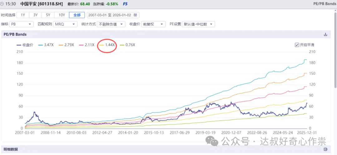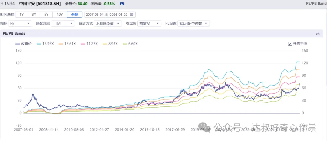 得益于预定利率下调以及居民存款搬家,2025年保险公司兼具保障与投资属性的分红险成为市场主力,驱动新业务迎来较好增长趋势。其次,新能源车险也异军突起,并且盈利持续改善。再而,资产端方面,受益于政策利好及资本市场活跃,险资加大权益市场配置。中国平安2025前三季度,保险资金投资组合实现非年化综合投资收益率5.4%(年化投资收益率平均水平是5%),同比上升1.0个百分点,投资业绩大幅提升。当前平安股息率为3.77%,假设按照其2025前三季度营业利润同比7.2%的增速,对应股息率还可以提升至3.77%*(1+7.2%)=4.04%。尽管当前中国平安的市盈率和市净率已经从底部反弹且呈向上攀爬趋势,但也还没到上市以来的估值中枢水平。