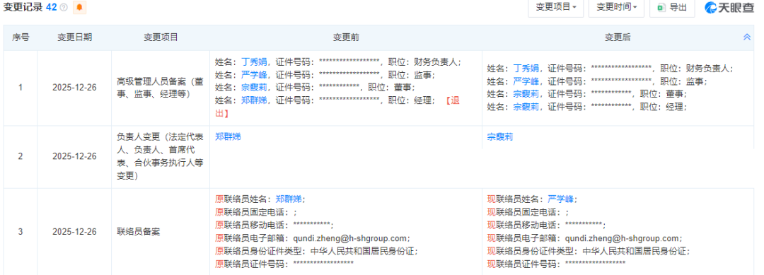 12月26日,法定代表人从郑群娣变更为宗馥莉,同时,郑群娣不再担任总经理,宗馥莉同时兼任董事和总经理。