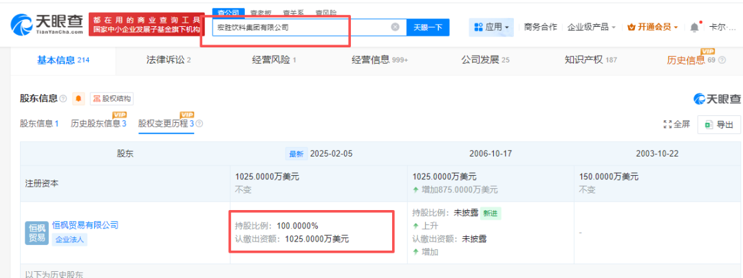 而宏胜集团由宗馥莉100%控股的恒枫贸易全资持有,她是唯一的股东,拥有绝对控制权。