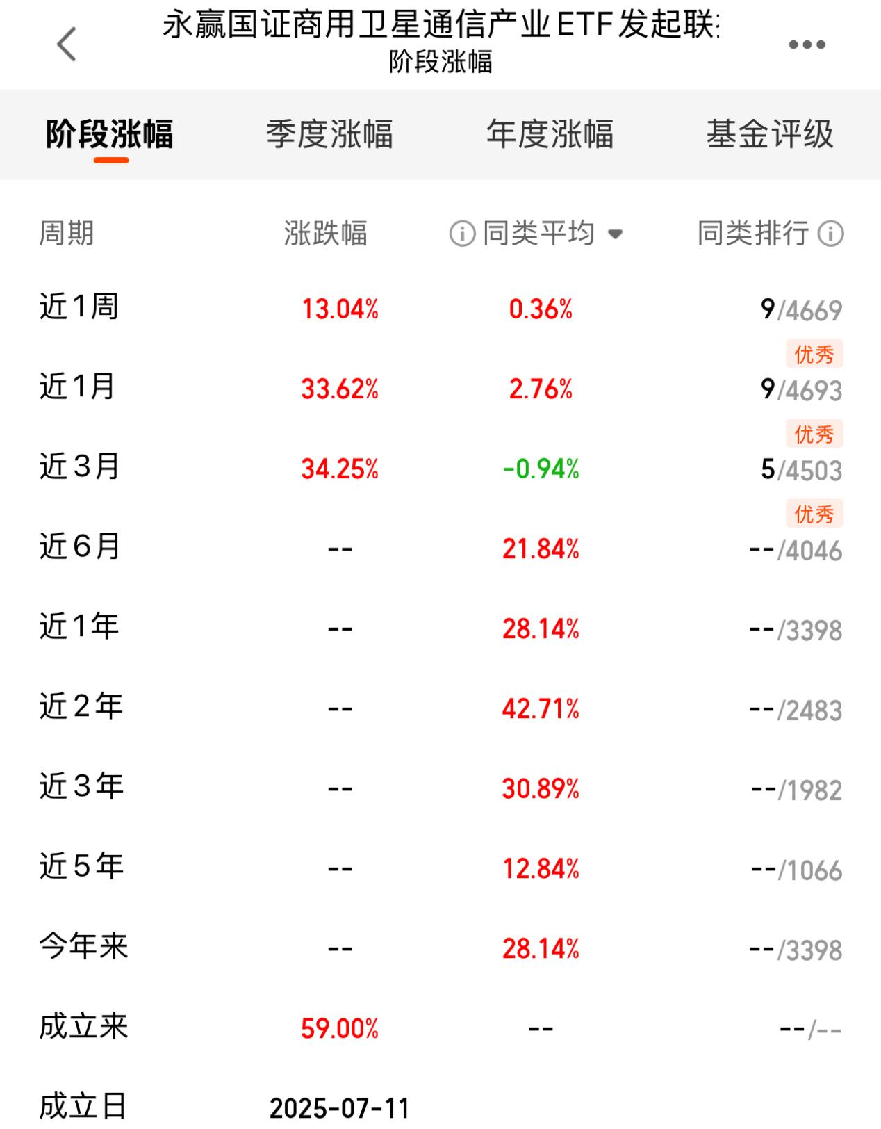 作为全市场唯一聚焦卫星互联网的指数基金,永赢国证商用卫星通信产业ETF发起联接C(A:024194;C:024195)的业绩表现堪称亮眼。近1周上涨13.04%,近1个月上涨33.62%,近3个月上涨34.25%,成立以来更是实现了59.00%的累计涨幅,多阶段收益在同类产品中均位居前列,为投资者带来了丰厚的回报。无论是短期把握行情还是长期布局,这只基金都展现出了较强的适应能力,满足了不同投资者的需求。