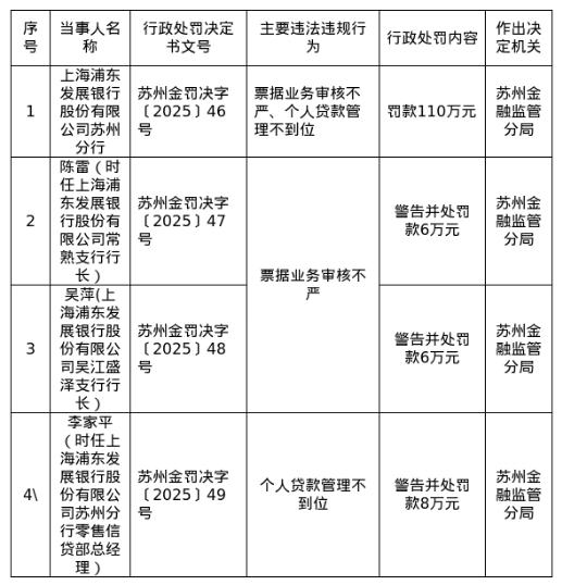 国家金融监督管理总局苏州监管分局发布了一张罚单,剑指上海浦东发展银行股份有限公司苏州分行及其相关责任人。罚单显示,浦发银行苏州分行的主要违法违规事实(案由)为:票据业务审核不严、个人贷款管理不到位。陈雷、吴萍、李家平对上述事项负有责任。针对上述违法违规行为,苏州金融监管分局对浦发银行苏州分行罚款110万元;对陈雷警告并处罚款6万元;对吴萍警告并处罚款6万元;对李家平警告并处罚款8万元。$浦发银行(SH600000)$
