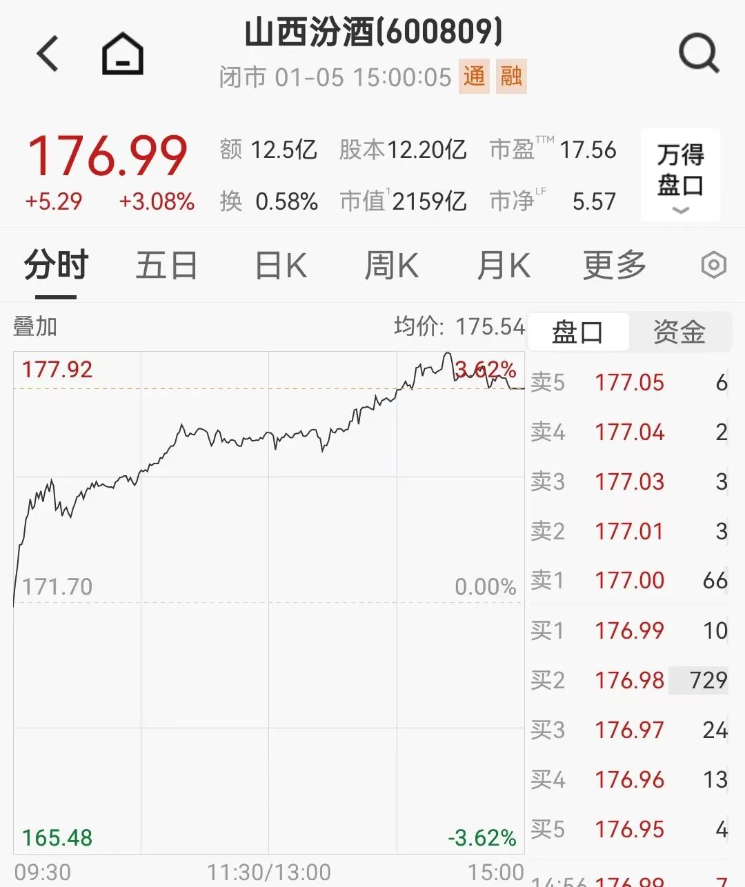 A股市场上,1月5日,山西汾酒一改往日颓势,股价连续拉升,截至收盘上涨超3%。