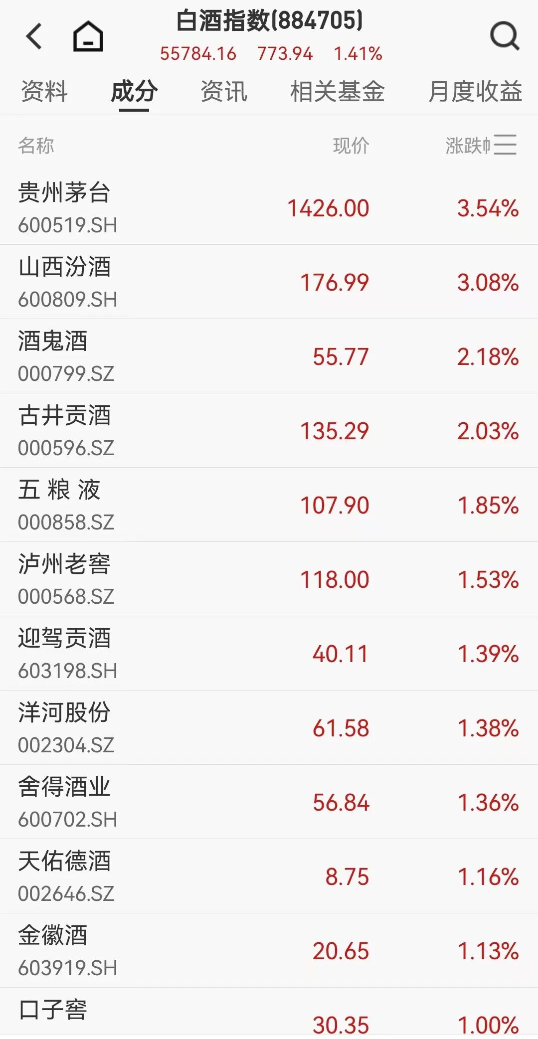 除了山西汾酒,白酒板块今日也大面积飘红。元旦期间有促销活动的贵州茅台领涨,山西汾酒、酒鬼酒、古井贡酒等跟涨。