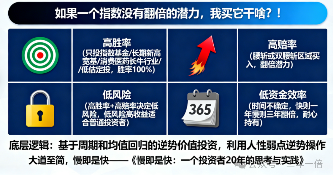 1、这个策略决定了:必须高胜率,要么不出手,只要出手,最终的结局大概率就是赢。 怎样才能高胜率呢? 我的策略就是不要操作个股,只操作指数基金,不操作个股只操作指数基金这一条就把胜率提高到了90%,而指数基金只操作长期新高的宽基指数以及消费医药等长牛的行业指数,这时胜率已经提高到了95%,最后只在低估时定投,这时胜率提高到了100%。 所以,我经常说,操作指数基金我100%的赚钱,就从来没有亏过,这也就是当我被套时,我呼吁抄我老底的勇气,因为这样我知道你们会赚的比我多。当我浮盈后,我从不会喊着让去追高。你们自己愿意追高买入,不愿意低估时买,那是你们自己的事,和我无关。 2、这个策略决定了:必须高赔率,这就是说最起码具备翻倍的潜力才值得去出手。 怎样才能高赔率呢? 我的策略就是我计划买入的指数前提就是要腰斩或者双腰斩,腰斩了才有资格加入我的自选,买入时最好是双腰斩区域,如果没有双腰斩的话,退而求其次腰斩后低估区域才会考虑出手定投。腰斩后低估区域才出手,这意味着具有翻倍的赔率,双腰斩出手意味着具有翻两倍的赔率。 3、这个策略决定了:一定是低风险,在高胜率、高赔率的这个两个条件下,已经决定了该策略的低风险特性。 其实,市场上高风险对应高收益这句话是不够全面且不严谨,资本市场上高风险往往对应着低收益,真正做到高风险高收益的投资者很少。而恰恰相反的是,获得高收益的投资者大部分都是采用低风险高收益的策略。而,低风险高收益的策略才是最适合普通投资者的策略。 4、这个策略决定了:低资金效率,这意味着时间往往不确定性,也许快,快则不到一年就翻倍;也许慢,慢则三年才翻倍,甚至更长点时间。但是,但是给它个三年的时间期限,一般都会有所表现。 其实对于普通投资者来说,时间最不值钱了,当满足了第一第二条买入后就是耐心的持有,你该干嘛就干嘛去,不香吗? 大道至简,慢即是快! 这就是我的投资策略,喜欢的拿走不谢。