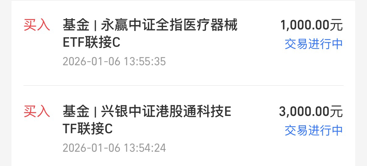 我买3000兴银中证港股通科技ETF联接C,理由是:假期港股率先开门红,昨天A股开市,跟随净值更新,我这只去年重点低吸的,单日涨超3%,爆发力杆杆的,现在港股还在低位,继续低吸。新的一年,高盛、瑞银、摩根大通等外资继续上调中国资产至“超配”,预期先进制造业和科技自立自强成为新的增长引擎,年均上涨幅度预计可能达到15%;现在人民币升值破7,港股公司赚取的利润折算成港币时会放大,迎来价值重估,所以我觉得这边已经在回升势头中,这只港基除了科技大厂们,还有半导体、智能车等制造业,以及开门红大涨的脑机接口也有覆盖到,我继续增加筹码。