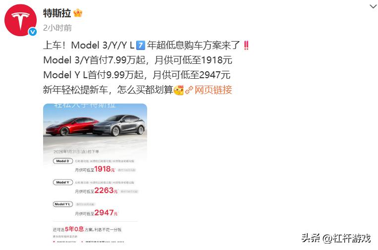 1月6日,特斯拉中国为购买Model 3和Model Y、Model Y L车型提供5年0息方案。 Model 3/Y首付7.99万起,月供可低至1918元;Model Y L首付9.99万起,月供可低至2947元。