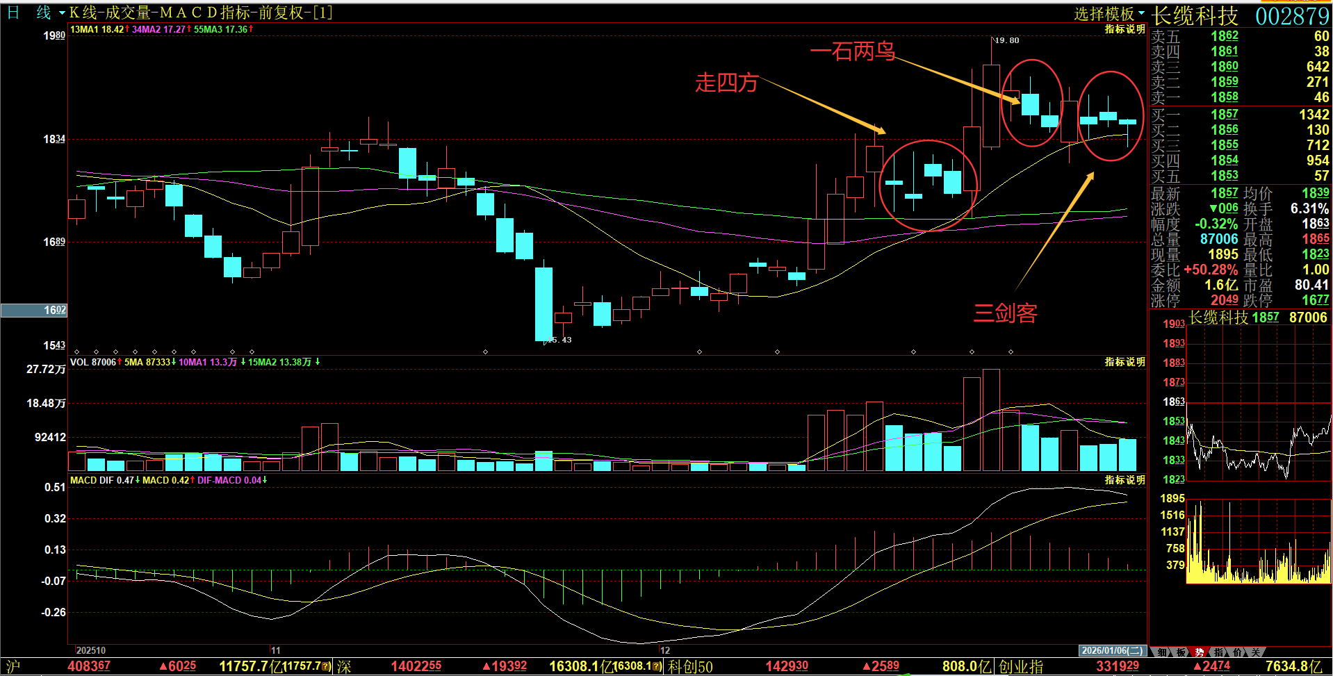 关于形态各周期均线参数,日线系统为:13、34、55;分时(包括60分钟、30分钟、15分钟、5分钟)系统为:5、10、20。形态通用。
