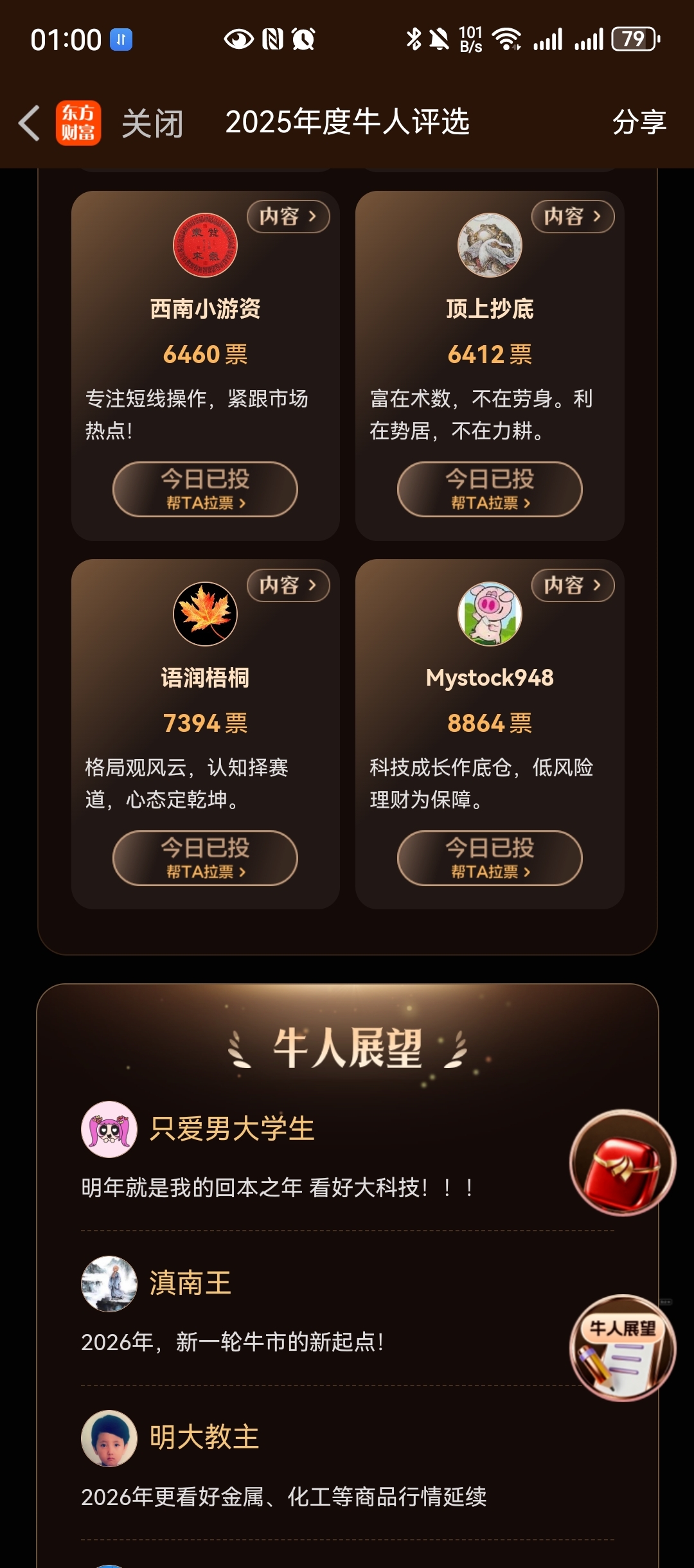 最后这次投票我也个人推荐了几位我欣赏的东财社区博主,@西南小游资 @顶上抄底 等四位希望大家最后也给他们投上最后一票。