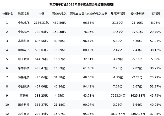 北斗星通最新报告期数据为三季度,下表汇总了军工电子行业内市值靠前的公司三季度主要经营数据