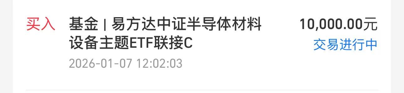$易方达半导体设备ETF联接C(OTCFUND|021894)$+10000元、易方达中证半导体设备+10000元,不好意思我又来追高了,1W应该问题不大,跌20个点也就2000,我还能承受。这支我之前买过,进去就开始回调,反正没怎么赚钱我就出来了,所以看好的板块还是要长拿才行啊,总有一刻会轮到它涨的,反正要么就是错过,要么就是硬抗,涨的好板块没有的时候真的很难受,东方人工智能也很不错,但是我还是选择这个吧。