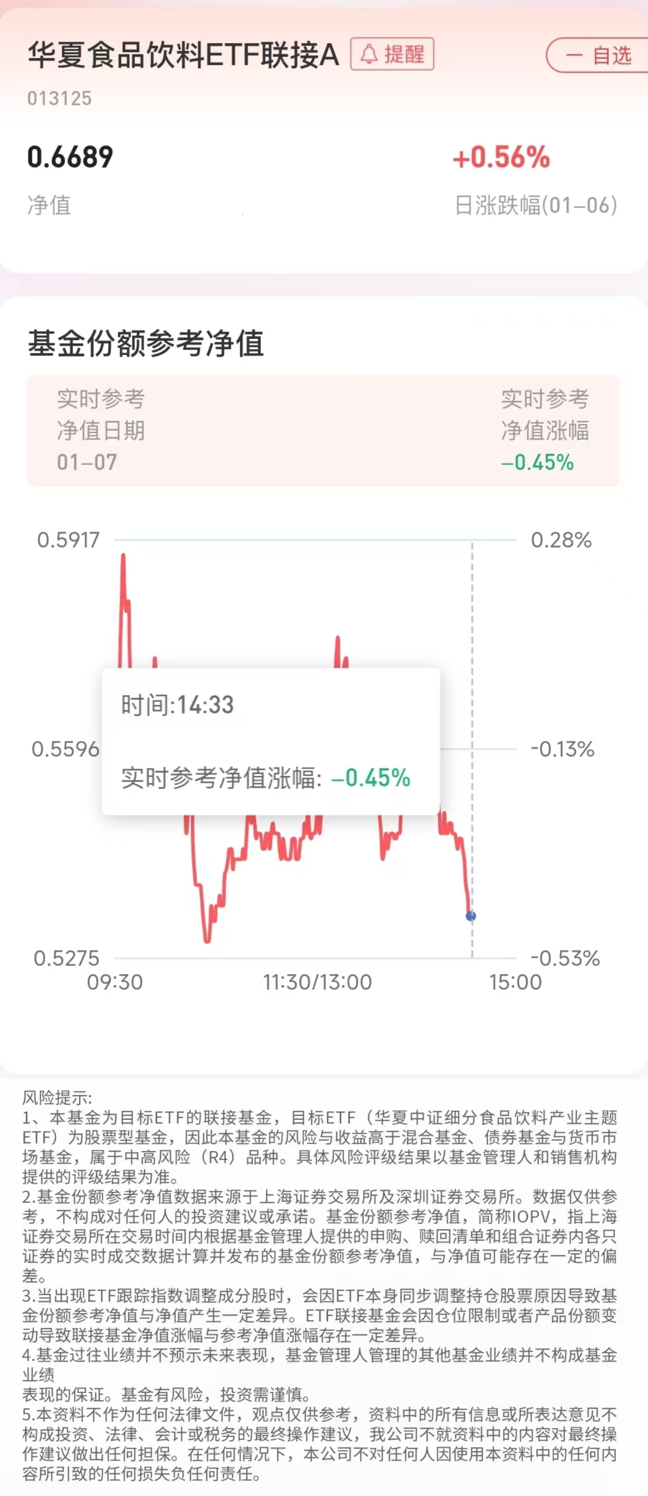 截止至2026年1月7日14:33,本基金跟踪目标基金的实时参考净值涨幅为-0.45%,其跟踪的指数最新PB(市净率)为4.50,处于较低区间。