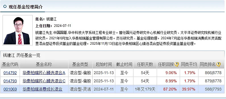 钱建江是2021年6月加入华泰柏瑞基金管理有限公司的。历任研究员、基金经理助理。2024年7月起任华泰柏瑞消费成长的基金经理。