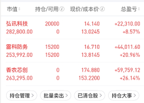今天进场弘讯科技,本来早盘想要清仓雷科防务,但是考虑到仓位不是很重,而且财哥很好奇它后面会走成什么样子,所以就留下了,没想到收获一个涨停,意外之财。香农芯创短线盈利已经很高了,暂时出场观望。