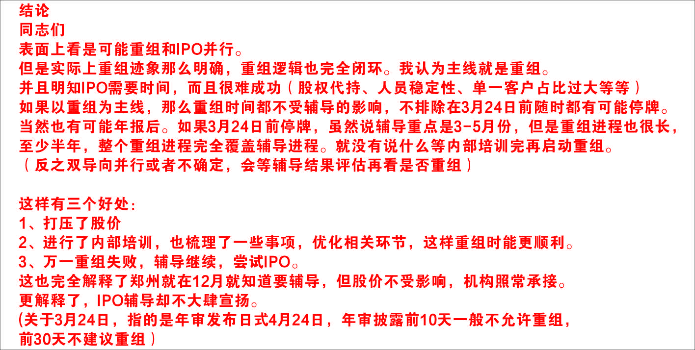 1、重组推进和IPO是两条线,没有冲突,可以同时推进。并且在重组推进当中,辅导不会停。因为万一重组失败,IPO还可以正常推进。