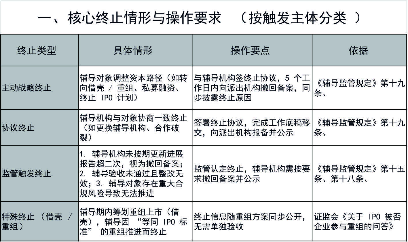 IPO 辅导终止分为主动终止、协议终止、监管触发终止三类,核心依据是《首次公开发行股票并上市辅导监管规定》(以下简称《辅导监管规定》),具体情形、操作要求与依据如下: