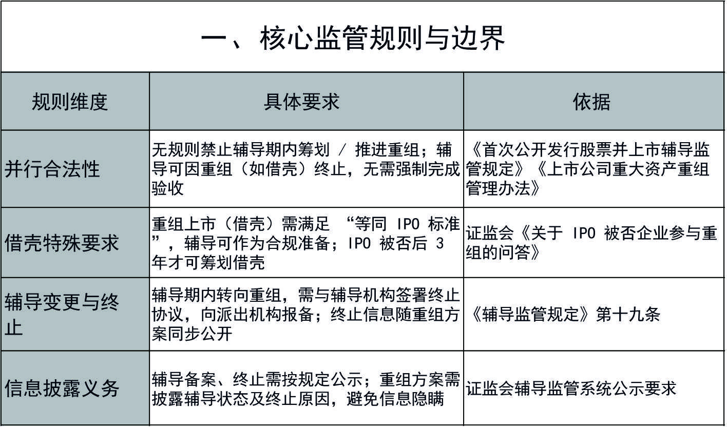 IPO 辅导与重组(含借壳)并行无明确禁止性规定,监管允许 “双线推进”,但需遵循辅导备案、信息披露、借壳等同 IPO 标准等核心要求,以下是规则与实操要点: