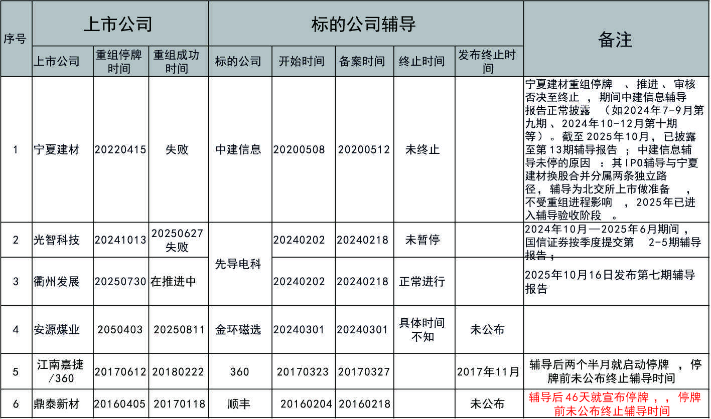 特别是下表的序号2-3的先导电科,重组了2次,辅导都没停。第二次重组还没确定是否成功,所以到2025年10月16日还正常发布第七期辅导报告,下一次发布报告时间是26年1月