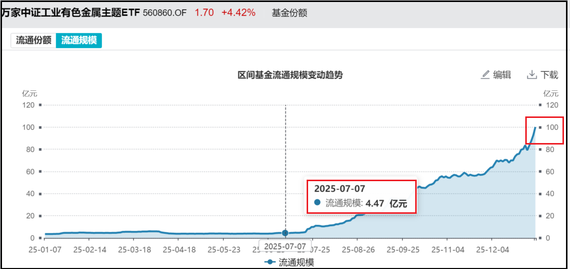 我们看下图,表韭量化,是去年7月,调入的工业有色ETF(560860)的联接基金,此后的半年时间里,作为挂钩该指数(中证工业有色金属)的唯一场内品种,其趁着这波有色金属的狂潮,扶摇至少,规模从5亿不到,干到了百亿。