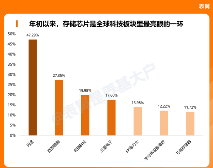 下图,是A股的半导体设备、存储器指数,以及韩国的存储芯片双巨头,再加美股的闪迪、希捷、西数,年初以来的涨幅,这无疑是全球科技板块里,最亮眼的一个分支。