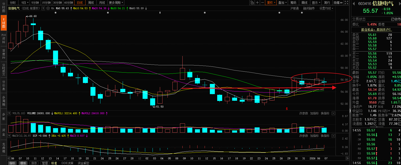 操作思路:昨日低开低走但只是缩量小幅下行从盘面观察五日线也是有较强的向上进攻趋势,证明昨天主力只是在试探清洗筹码,那么今天要是能站稳五日线上方56区间价位并且分时量能持续放大埋单承接有力我会小仓低吸进场,目标价位先到62-65 元博弈机器人和半导体双主线共振的低位补涨行情。