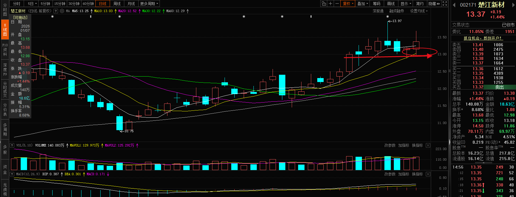 楚江新材入场逻辑扎实:军工碳材端,天鸟高新垄断火箭喷管喉衬供应,3.5 亿订单满负荷交付,顶立科技核聚变样件已交付;铜基端 0.05mm 超细导体量产,机器人订单增 180%。2025 前三季净利暴增 2089%,65 亿未交付订单 40% 来自新兴领域,叠加子公司 IPO 推进,波段布局性价比突出。