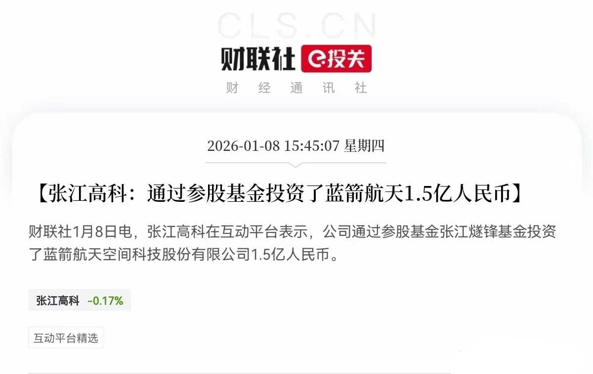 下午3点45分,张江高科发布了重大公告称,公司通过参股基金投资了蓝箭航天1.5亿元,此消息一出,持有张江高科的股民们高兴的跳起来了,这对于张江高科的股价走势是重大利好消息,市场目前最确定的主线就是商业航天板块,明日在利好催化下有望继续火热行情,而蓝箭航天又是一家正处于上市辅导阶段的、掌握液氧甲烷火箭核心技术的头部民营航天公司,若成功上市,蓝箭航天将成为中国首家民营商业火箭上市公司,相当于张江高科也间接有了商业航天概念,这是最大利好消息,不出意外的话,张江高科短期要受到大资金的青睐了,行情催化剂来了,明日值得期待…
