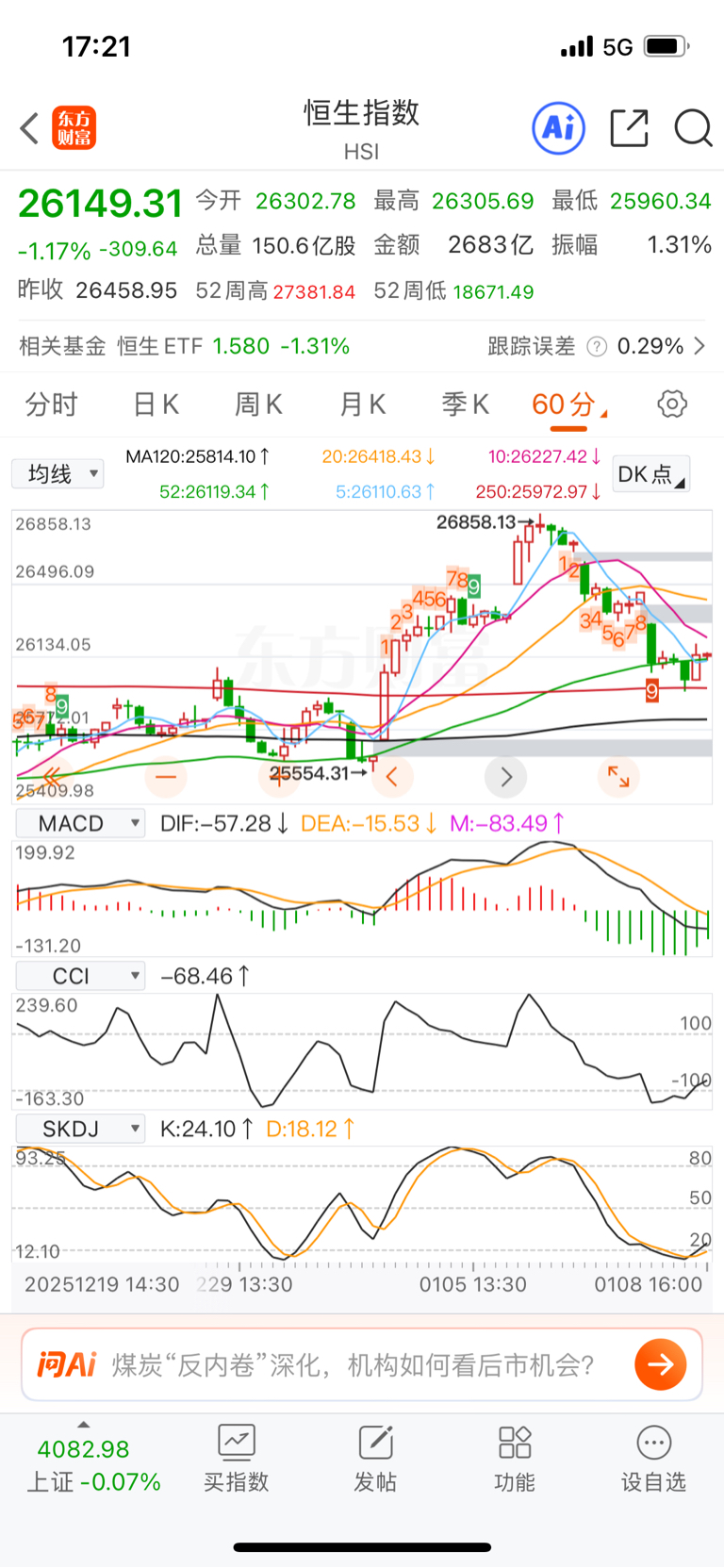 通盘无妙手,这是一句围棋术语,意思是不追求一招致胜的打法,而是通过持续子力调动和布局,先确保自身的安全,构筑起自己的护城河,在局势变化中耐心等待机会。孙子兵法上是这样说的:“先为己之不可胜,以待敌之可胜”。运用到股市上面,就是不要期待极致的涨停或者跌停,而是保持“中”的精神和“中”的仓位以及“中“的操作。卡斯帕罗夫曾经提到过一个词,叫“警惕性无为”,意在通过微小的调整来慢慢加强自己的局面,同时消除自己所面临的潜在威胁。放三张今天恒生、上证和怡亚通60分钟的走势,有兴趣的朋友可以比较一下。