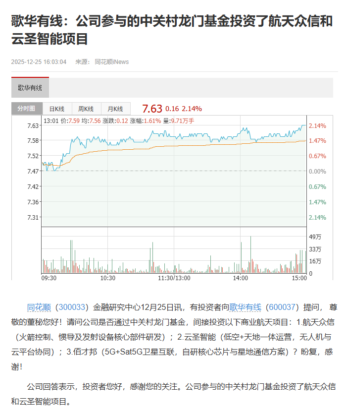 除丝路金桥基金外,歌华有线还通过中关村龙门基金等平台(累计高科技领域投资超 5 亿元),构建了覆盖商业航天、5G 通信、云技术的投资矩阵。