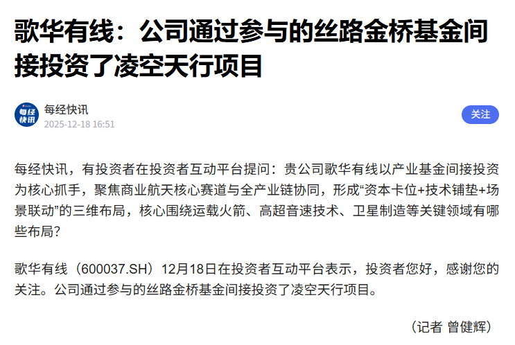 公司通过北京歌华丝路金桥传媒产业投资基金(出资 3.13 亿元)持有凌空天行 3.66% 股权,成为上市公司中参股该企业比例最高的主体。作为国内唯一专注于高超音速飞行技术商业化的企业,凌空天行已实现 “ - 1000” 高超音速导弹量产(射程 500-1300 公里,速度 5-7 马赫,成本仅为传统方案的 1/10),同时具备火箭研发、总装、测试、发射全流程能力,其千万亿次高性能计算中心、防隔热技术等核心资源,为歌华有线提供了稀缺的商业航天技术对接窗口。