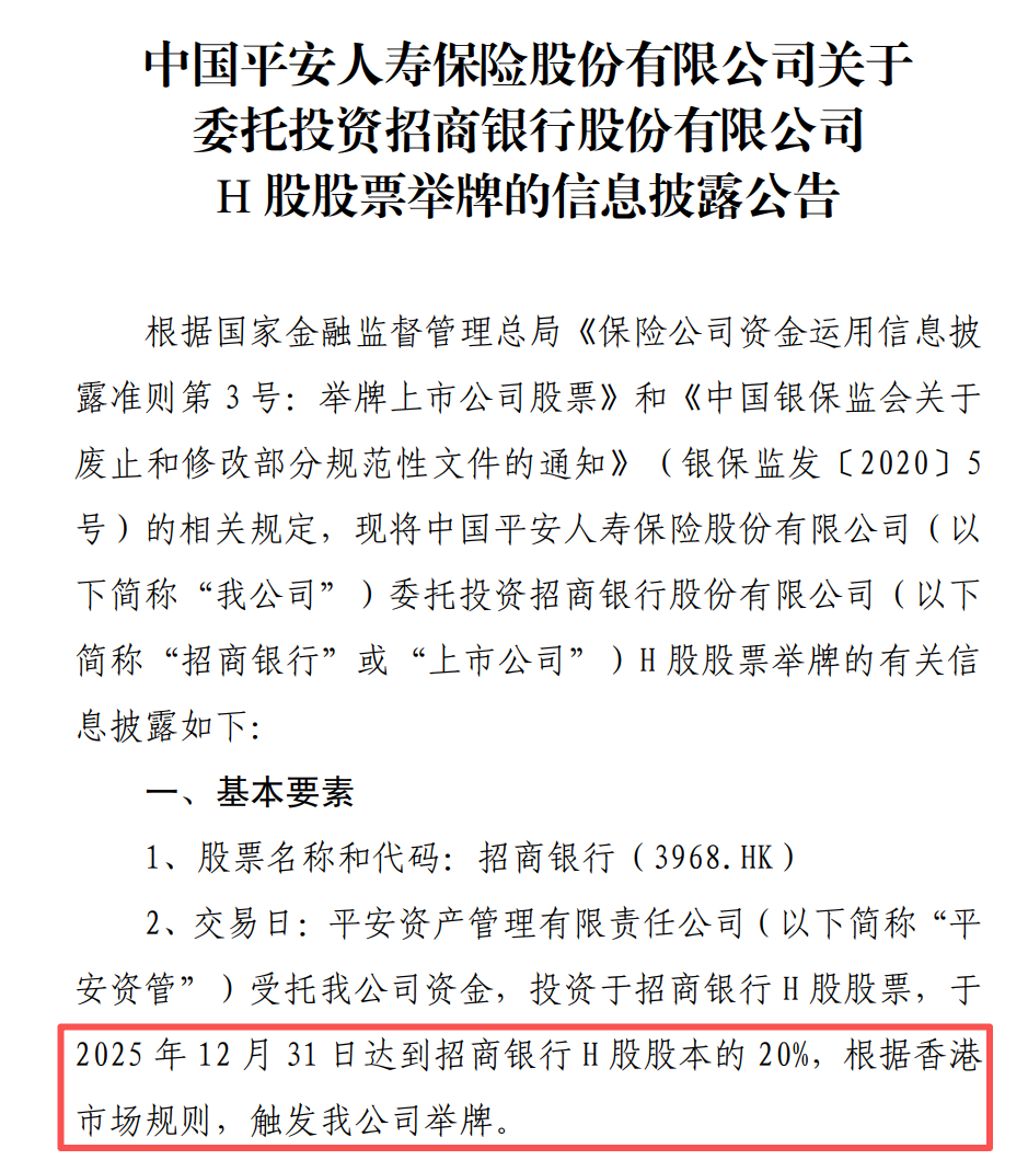 平安人寿表示,平安资管受托该公司资金,投资于招商银行H股股票,于2025年12月31日达到招商银行H股股本的20%,根据香港市场规则,触发举牌。截至2025年12月31日,公司持有招商银行H股股票的账面余额为439.56亿元,占上季度末总资产的比例为0.78%。