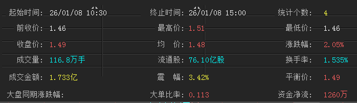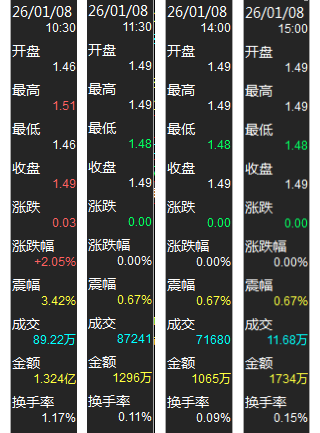 价格走势:开盘1.46元(与前日收盘价一致)→快速冲高至当日最高点1.51元→回落至1.49元收盘,单时段涨幅2.05%(占当日总涨幅的100%)。