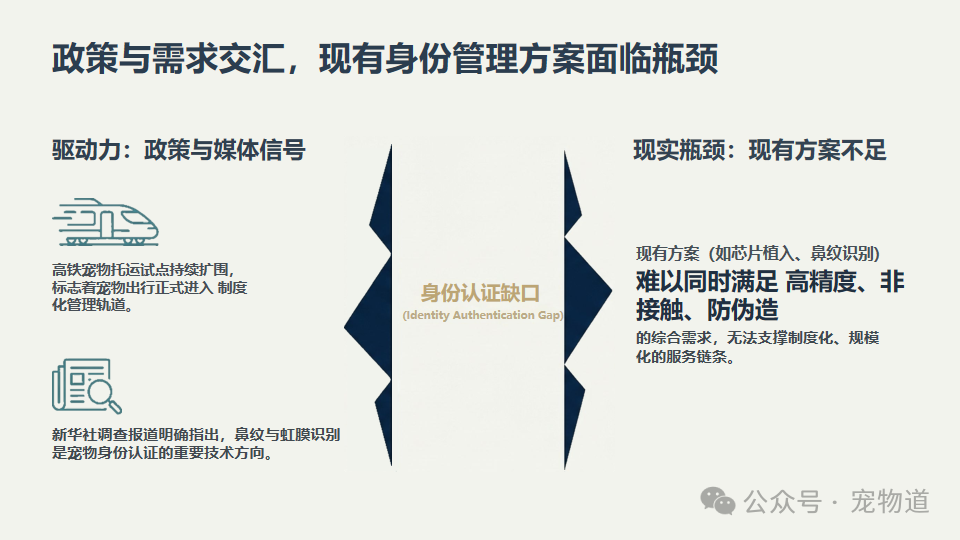 传统的项圈吊牌容易丢失伪造,芯片植入需要手术且存在排异风险,鼻纹识别精度有限……宠物身份管理,亟需更可靠的技术方案。