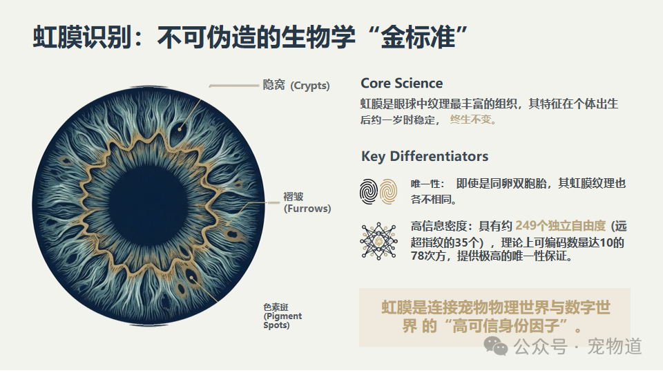 白皮书将虹膜识别定位为宠物身份管理体系中的”高可信身份因子”——不一定是唯一的身份标识,但在托运交接、保险理赔、走失找回等关键环节不可或缺。