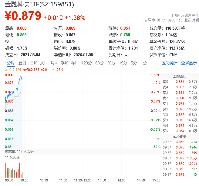 热门ETF方面,金融科技ETF(159851)场内价格上涨1.27%,成交额达1.02亿元。